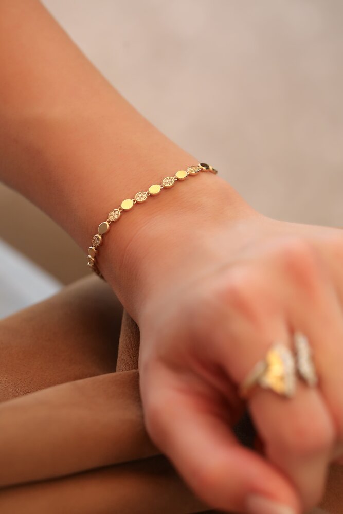 4,42 gram ağırlığında ve 14 ayar sarı altından üretilen Viona Bileklik, gün boyu konfor sunan hafif yapısı ve göz alıcı parlaklığıyla öne çıkıyor. Özel kesim altın pulların yarattığı ritmik doku, pırıltılı taşların enerjisiyle birleşerek stilinize modern bir prestij katar.