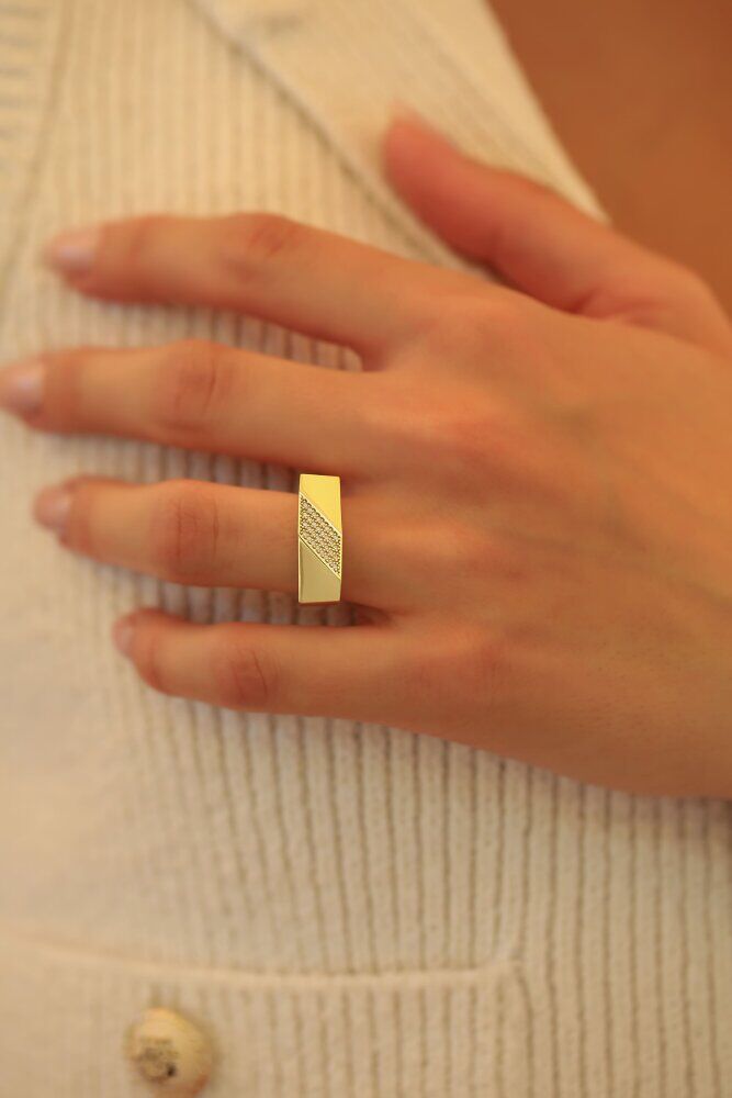 14 ayar sarı altından üretilen Aren Yüzük, 3,18 gram ağırlığındadır. Düz bant formu üzerindeki diyagonal detay, yüzüğe net ve dengeli bir ifade kazandırır. Tek başına kullanıldığında belirgin bir duruş sunar; sade kombinlerde güçlü görünür, birlikte kullanımlarda çizgisini bozmadan uyum sağlar.