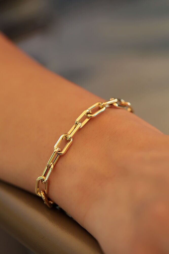 9,17 gram ağırlığında ve 14 ayar sarı altından üretilen Artus Bileklik, birbirine kusursuzca geçen dik açılı birleşme noktalarıyla karakter sahibi bir tasarım sergiler. Saf altın ışıltısını geniş bir yüzeyle buluşturan bu parça, modern mücevher sanatının iddialı bir örneğidir.