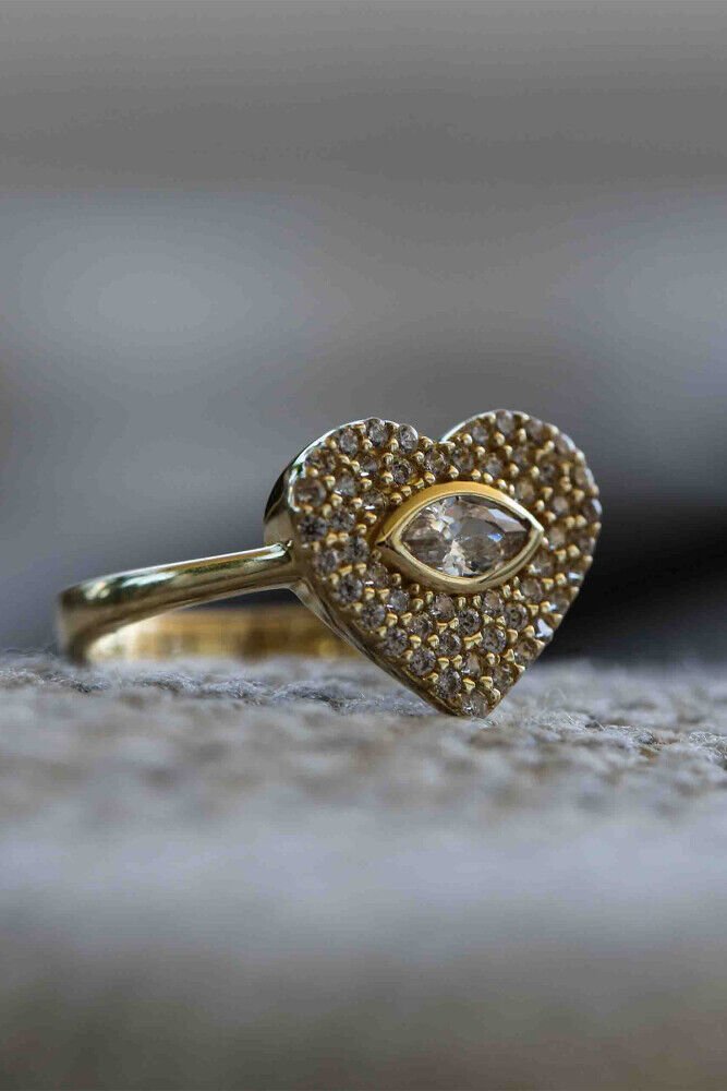 Kalp formunun romantizmiyle göz figürünün anlamını buluşturan özel bir tasarım. 14 ayar sarı altınla hazırlanan model, 2.46 gram ağırlığında. Işıltılı detaylarıyla güçlü bir stil dokunuşu sunar; hem anlamlı hem de dikkat çekici.