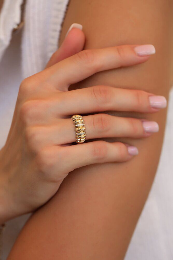 14 ayar sarı altından üretilen Brio Yüzük, 3,13 gram ağırlığındadır. Burgu formunun verdiği hacim, parmak üzerinde net ve dengeli bir duruş oluşturur. Tek başına kullanıldığında güçlü bir görünüm sunar; sade kombinlerde öne çıkar, birlikte kullanımlarda ise ana parça olarak kendini korur.