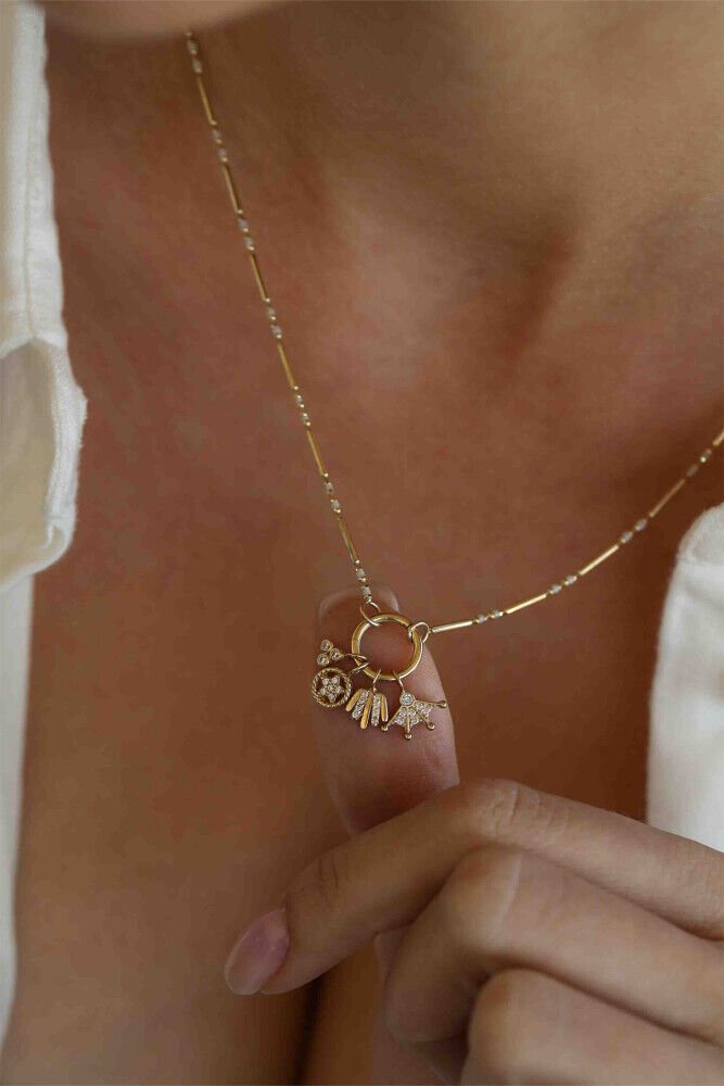 5,09 gram 14 ayar sarı altından üretilen Charm Kolye, zarif zincir yapısını farklı figür ve taş detaylarıyla tamamlıyor. Ortadaki halka üzerinden sarkan minik semboller, kolyeye neşeli ve enerjik bir hava katarken, kombinlerinize benzersiz bir dokunuş kazandırır. Kendi tarzını yaratmak isteyenler için ideal bir tercih.