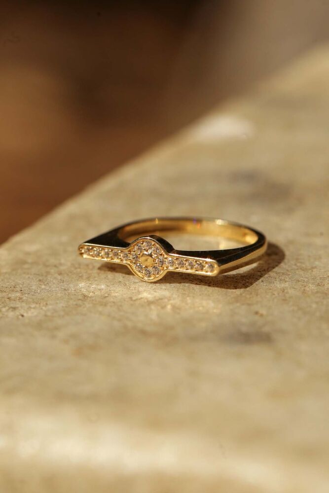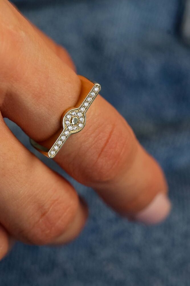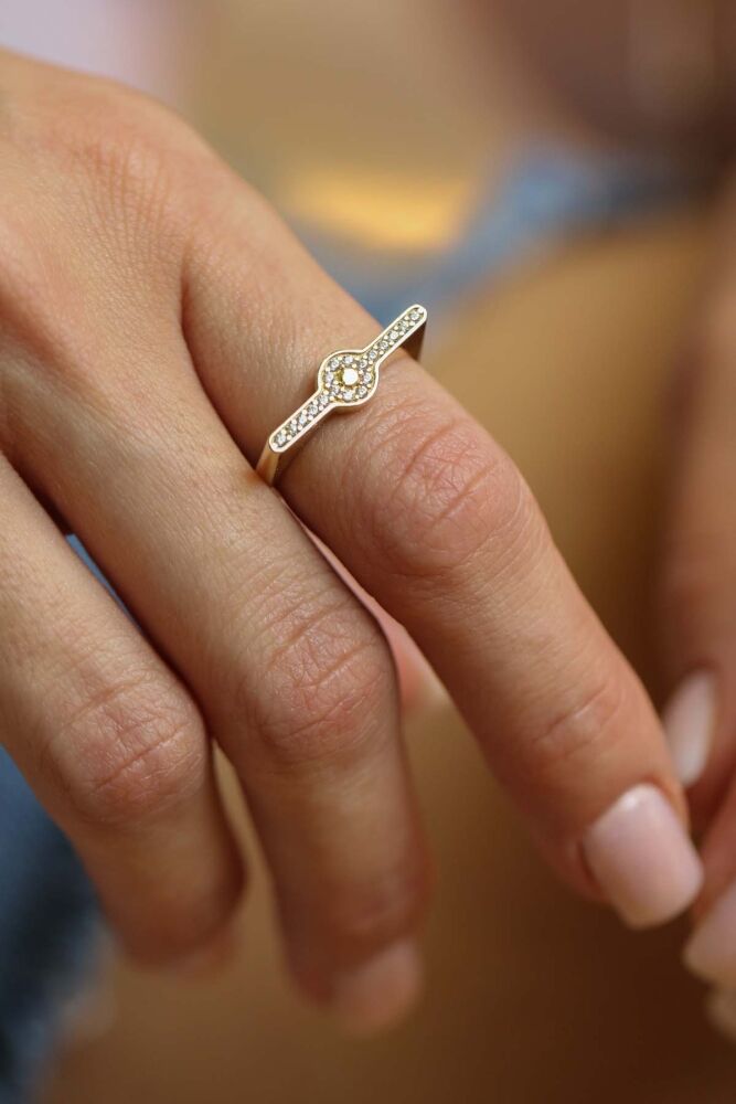 Ortadaki dairesel formu ve taş detaylı kollarıyla Cirella Yüzük, minimalizmi şıklıkla buluşturuyor. 2,05 gram 14 ayar altın yapısıyla hafifliği ve modern tasarımıyla günlük stilinize zarif bir dokunuş katarken, özel anlarda da göz alıcı bir tamamlayıcı oluyor.