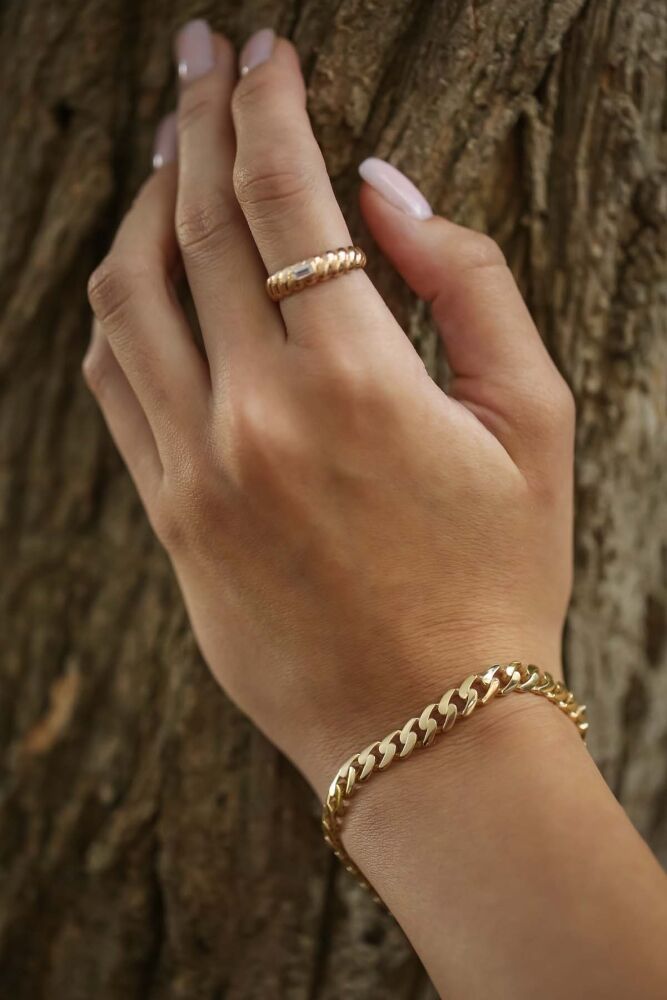 9,54 gram 14 ayar altınla tasarlanan Elnis Bileklik, klasik zincir formunu modern bir yorumla buluşturur. Zamansız tasarımıyla günlük şıklığa zarif bir dokunuş katar, özel anlarda ise stilinizi sofistike bir şekilde tamamlar.