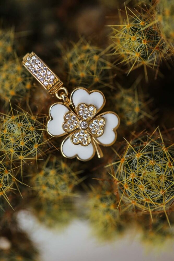 4,14 gram 14 ayar altın ile tasarlanan Evia Charm, beyaz mine detaylı dört yapraklı yonca formu ve parıltılı taş süslemeleriyle şansı ve zarafeti bir araya getirir. Hem kolye hem de bilekliklerde kullanılarak stilinize özel bir anlam katar.