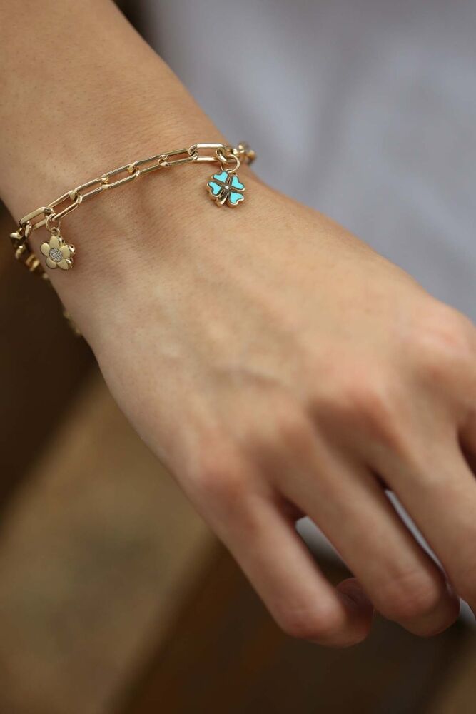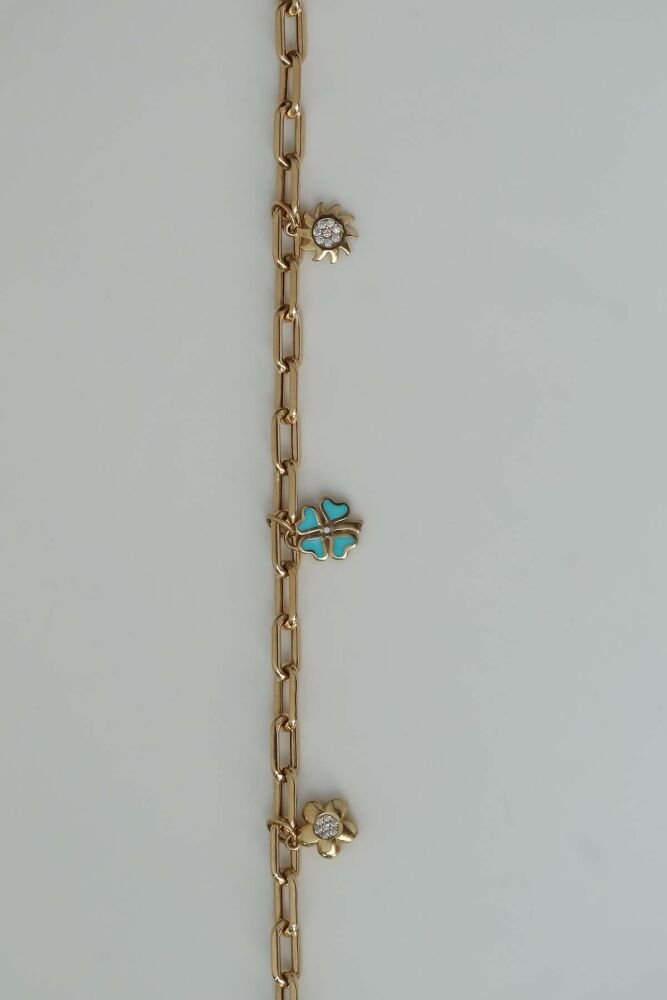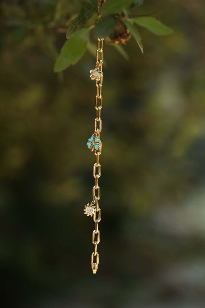 6,03 gram 14 ayar altından tasarlanan Fioris Bileklik, çiçek, yonca ve güneş charm detaylarıyla neşeli ve zarif bir görünüm sunuyor. Doğadan ilham alan bu özel tasarım, bileğinize canlılık katarken, günlük stilinize de pozitif bir enerji taşıyor.