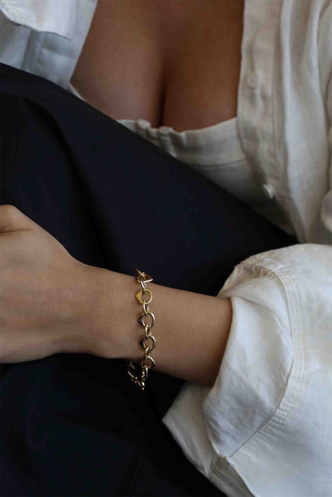 Aşkın enerjisinden ilham alan Hearty bileklik, kalp formundaki halkalarıyla zarafeti ve romantizmi bir araya getiriyor. 14 ayar sarı altın ile üretilen bu özel parça, ışıltılı görünümüyle her anınıza duygusal bir dokunuş katıyor. 8.32 gram ağırlığıyla hem şık hem de günlük kullanıma uygun.