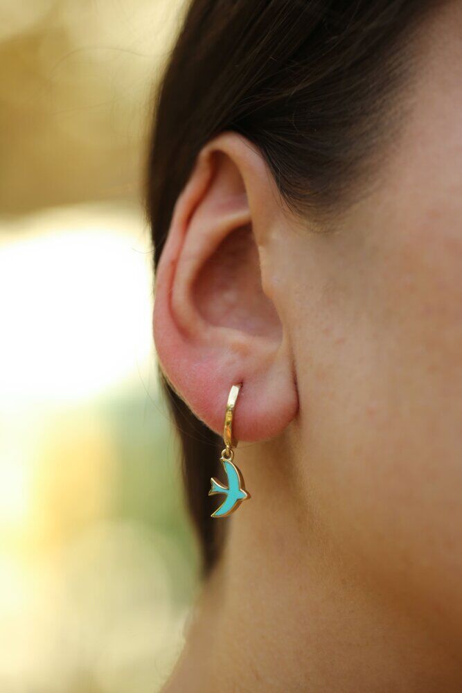 2,11 gram ağırlığında ve 14 ayar sarı altından üretilen Liberta Küpe, turkuaz mineli kuş figürüyle özgürlüğü ve huzuru simgeler. Altının sıcaklığı ile canlı mine renginin uyumu, kulaklarınızda taze ve enerjik bir şıklık yaratır.