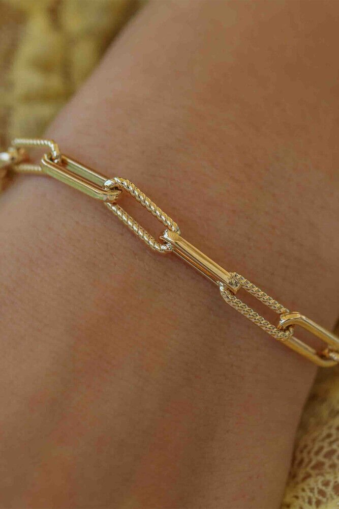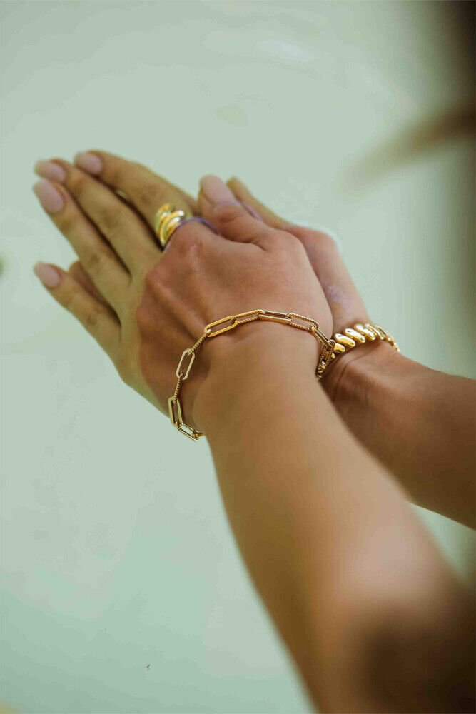 Modern çizgilerle yorumlanmış Lineis bileklik, 14 ayar sarı altınla tasarlanmıştır. İnce uzun halkaları ve örgü detaylı geçişleriyle sade ama etkileyici bir stil sunar. Günlük kullanıma uygun olduğu kadar, şıklığınızı tamamlayacak zarif bir tamamlayıcıdır.