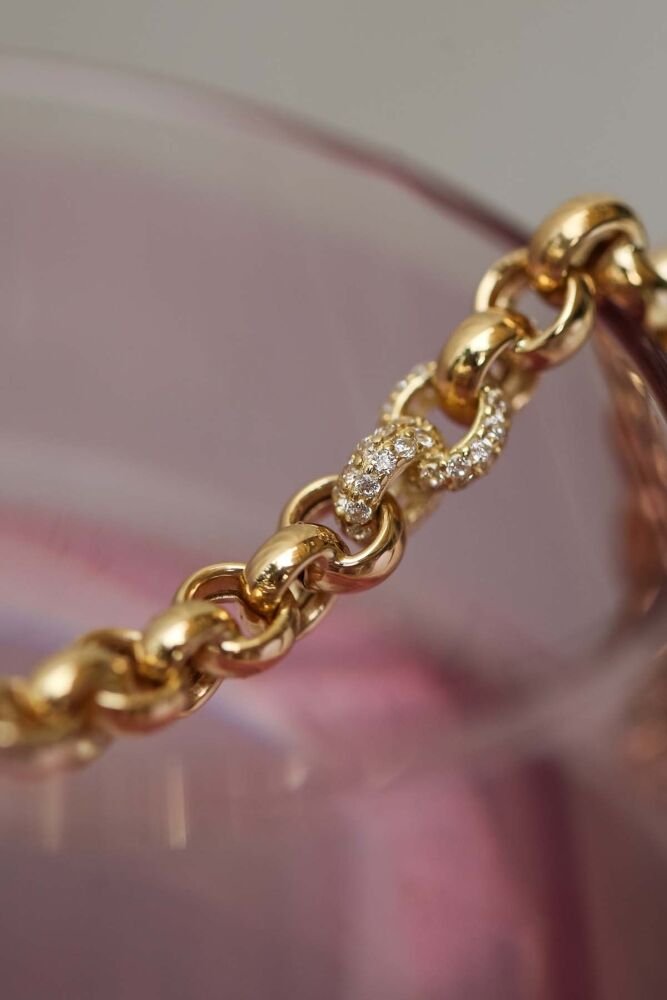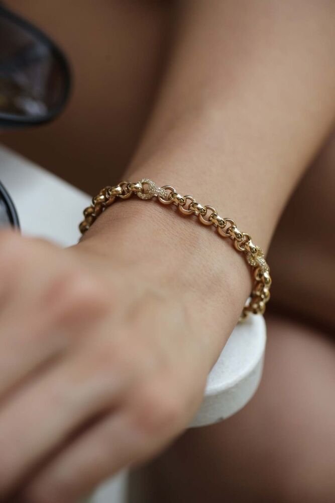 7,97 gram 14 ayar altından tasarlanan Lucira Bileklik, kalın zincir halkalarıyla güçlü bir stil sunarken, taşlarla bezeli özel bağlantı detayıyla şıklığınıza zarif bir dokunuş katıyor. Hem günlük kombinlerde hem de özel davetlerde dikkat çekici bir tamamlayıcı.
