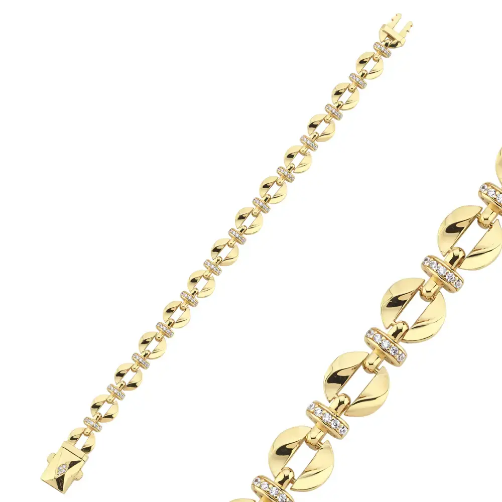 Parlak altın disklerin arasına zarif taş detaylarının eşlik ettiği Lunira bileklik, ışıltısıyla göz kamaştırır. Hareketli yapısı ve ritmik geçişleriyle bilekte ışığı yansıtan zarif bir oyun sunar. 14 ayar sarı altından üretilmiş olup 11.41 gram ağırlığındadır. Klasik çizgileri modern detaylarla buluşturan şık ve özgün bir tasarımdır.