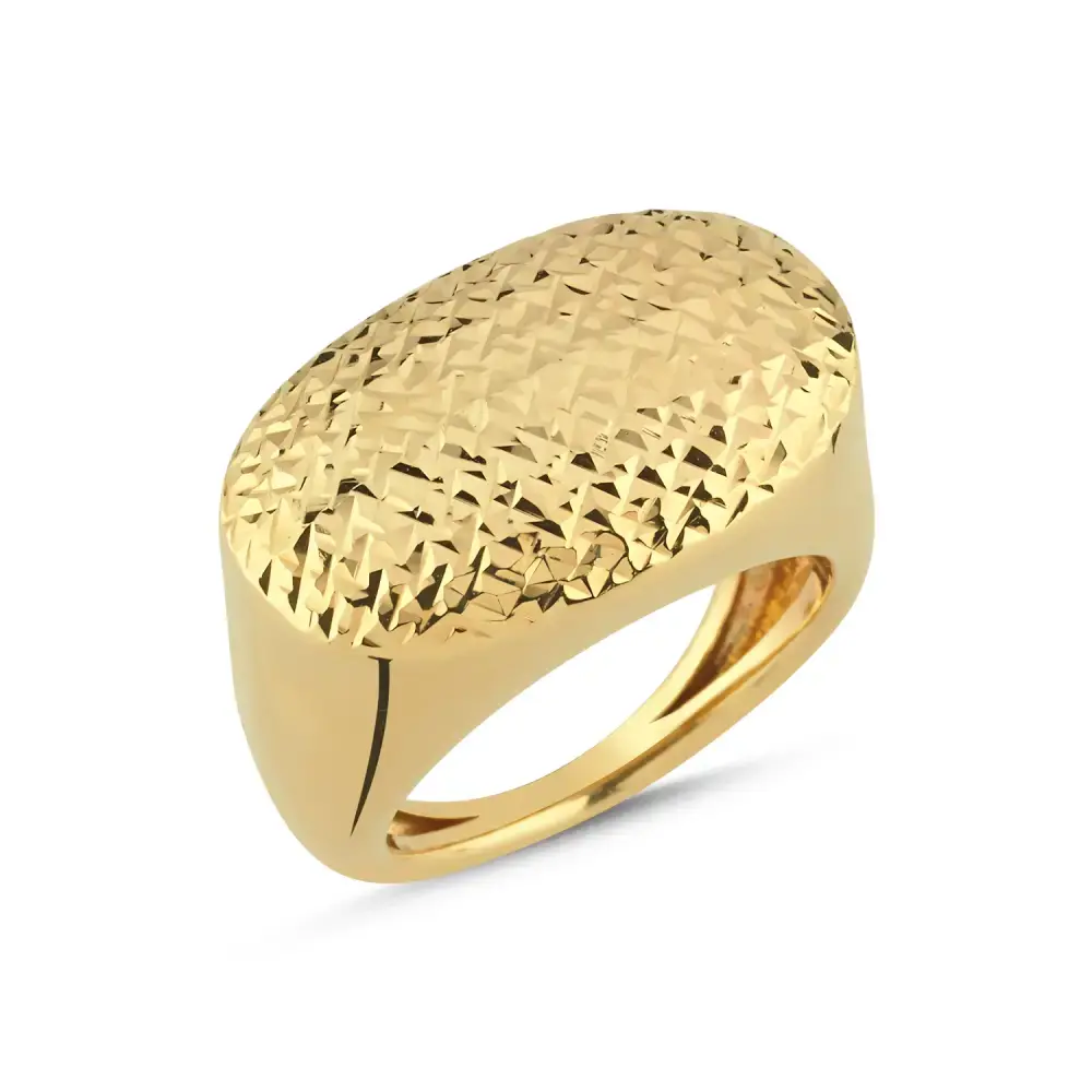 Şık yüzey deseniyle öne çıkan bu Mirexon Yüzük, tarzını sade ama etkileyici detaylarla yansıtmak isteyenler için özel olarak üretildi. 14 ayar sarı altından yapılan bu model, 3.50 gram ağırlığındadır. Işığı yansıtan dokusuyla zarafet ve dikkat çekiciliği bir arada sunar.