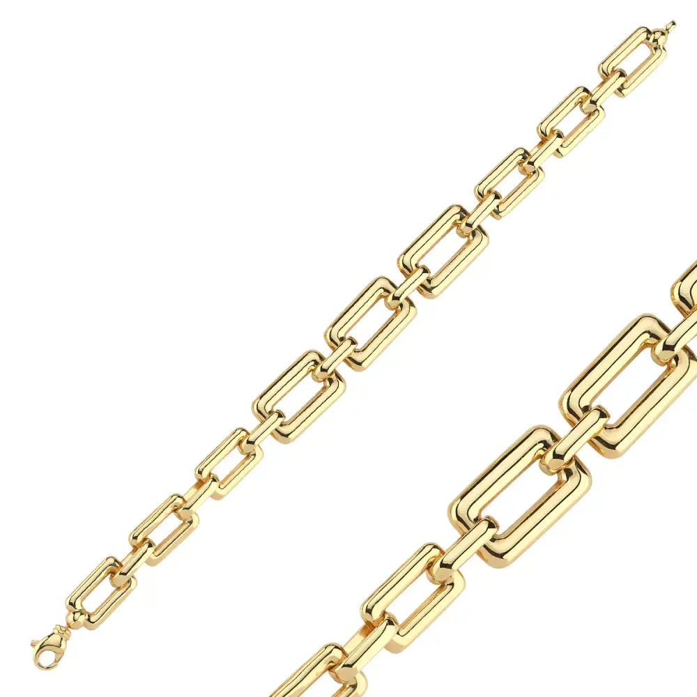 Modern çizgileriyle öne çıkan ataç formundaki halkalarıyla tasarlanan bu bileklik, 14 ayar sarı altınla üretilmiştir. 9,21 gram ağırlığıyla hem hafif hem de stil sahibi bir görünüm sunar.