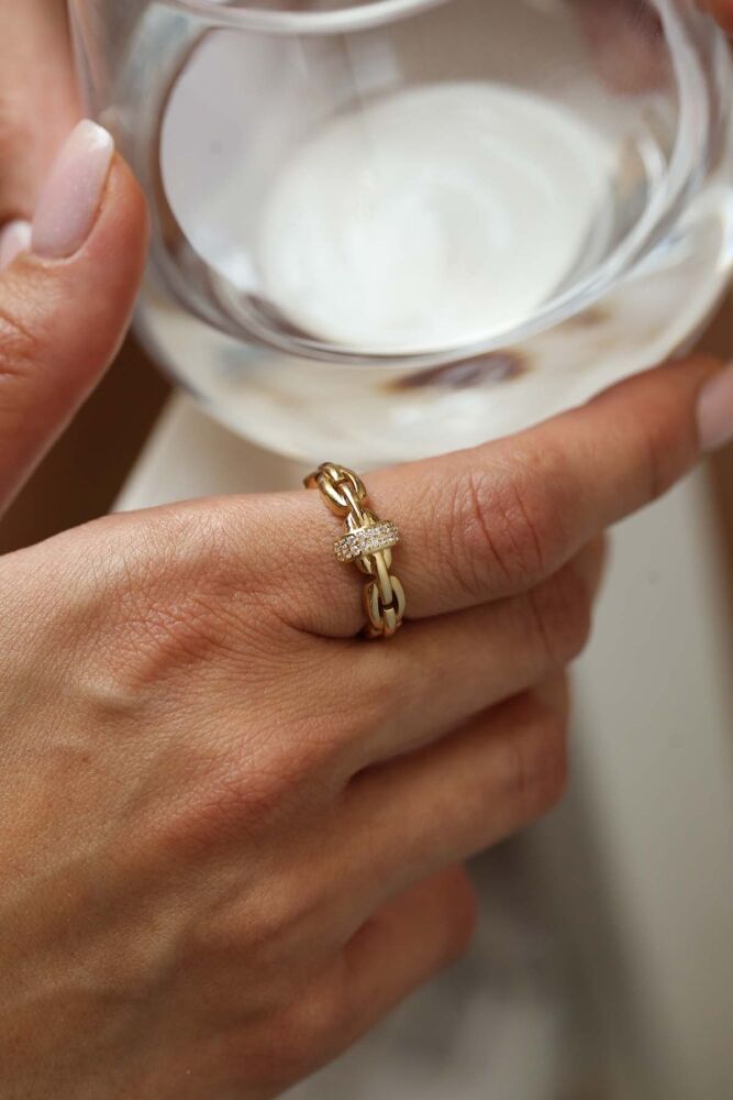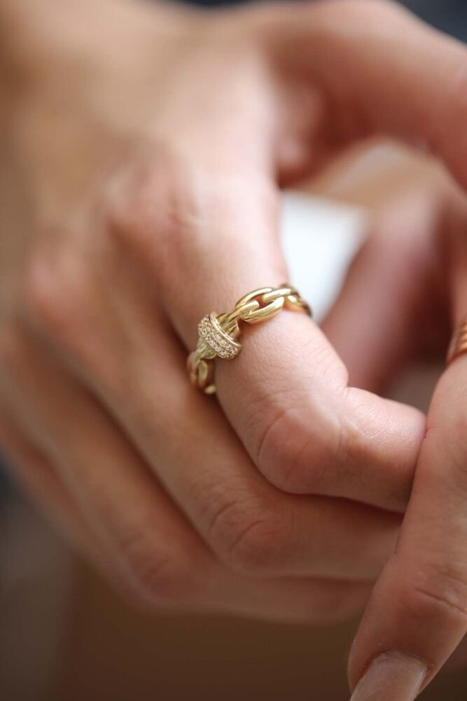 2,58 gram 14 ayar sarı altından tasarlanan Nexa Yüzük, zincir formundaki şık halkaları ve ortasında yer alan taşlı bağ detayıyla modern bir zarafet sunar. Güçlü ve sofistike tasarımıyla günlük stilinize dinamizm katarken, özel anlarınıza da asil bir ışıltı taşır.