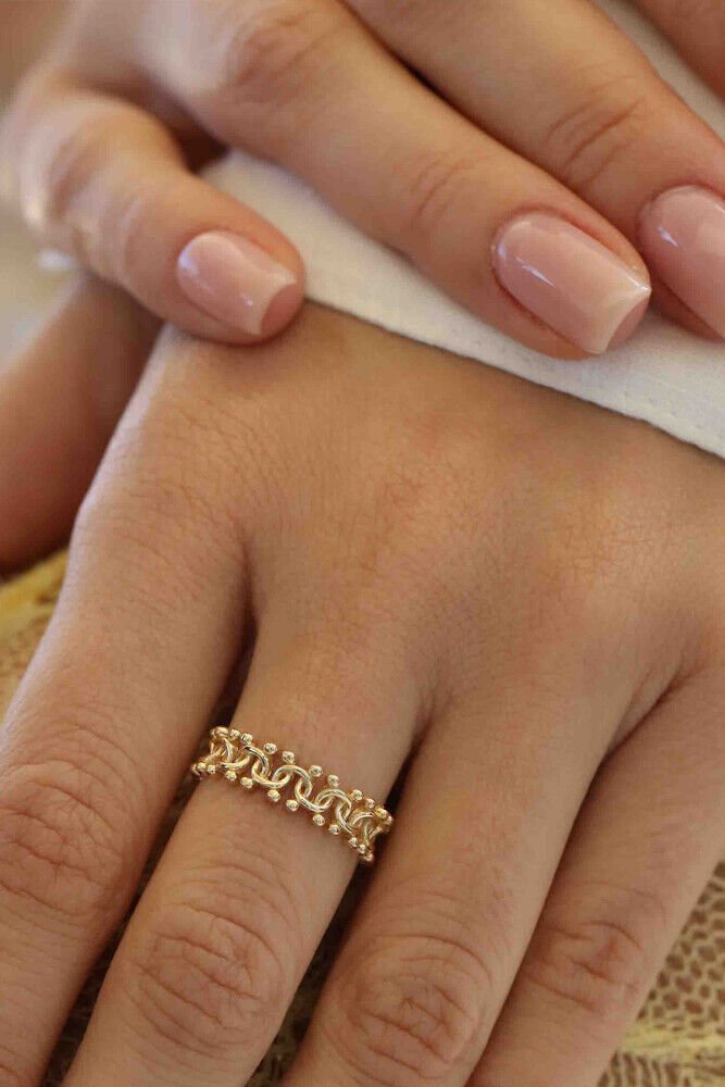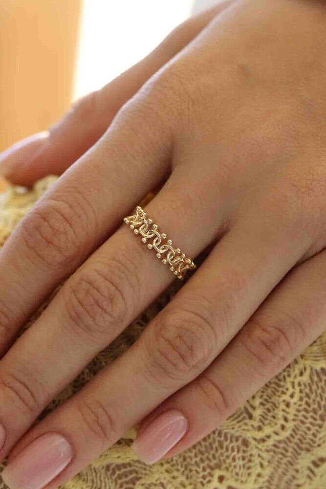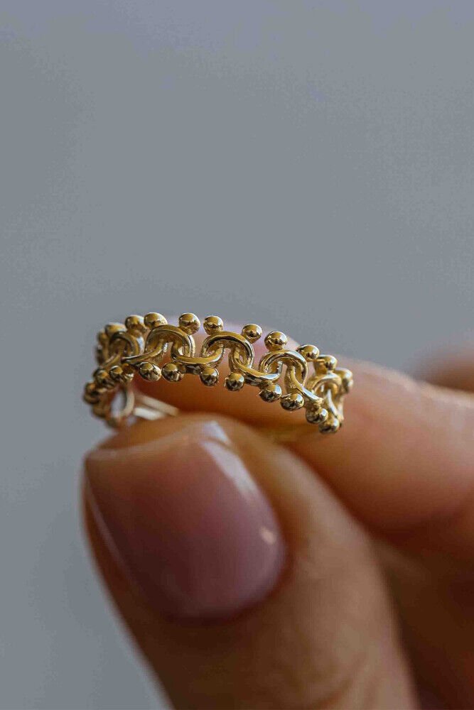 İnce işçiliği ve zarif detaylarıyla öne çıkan Nora, 14 ayar sarı altının klasik ışıltısıyla tasarlandı. 1.95 gram ağırlığındaki bu özel yüzük, dantel dokusunu andıran formuyla sade ama etkileyici bir şıklık sunar. Günlük stilinize zarif bir dokunuş katarken, özel anlarınıza da zarafetle eşlik eder.