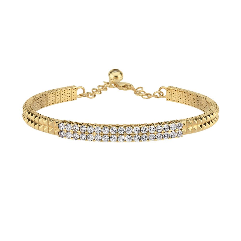 İki sıralı taş dizilimiyle zarafeti ön plana çıkaran tasarım, 14 ayar sarı altından üretilmiş olup 12.44 gram ağırlığındadır. Modern detaylarla bezeli yapısı, hem günlük kullanıma hem özel davetlere uyum sağlar.