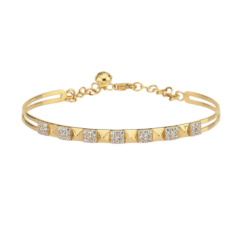 Minimal formuna rağmen dikkat çeken üçgen yüzey ve taş geçişleriyle dinamik bir görünüm sunar. 14 ayar sarı altından üretilen model, 7.40 gram ağırlığındadır. Günlük şıklığa zarif bir hareket katmak isteyenler için ideal.