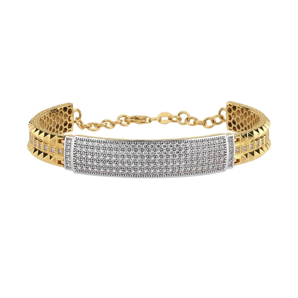 Tamamen taşlarla kaplı ön yüzeyiyle güçlü bir parıltı sunan model, 14 ayar sarı altından üretilmiştir. 13.85 gram ağırlığıyla dikkat çeken tasarım, ışıltıyı zarafetle buluşturmak isteyenler için ideal bir tercih.
