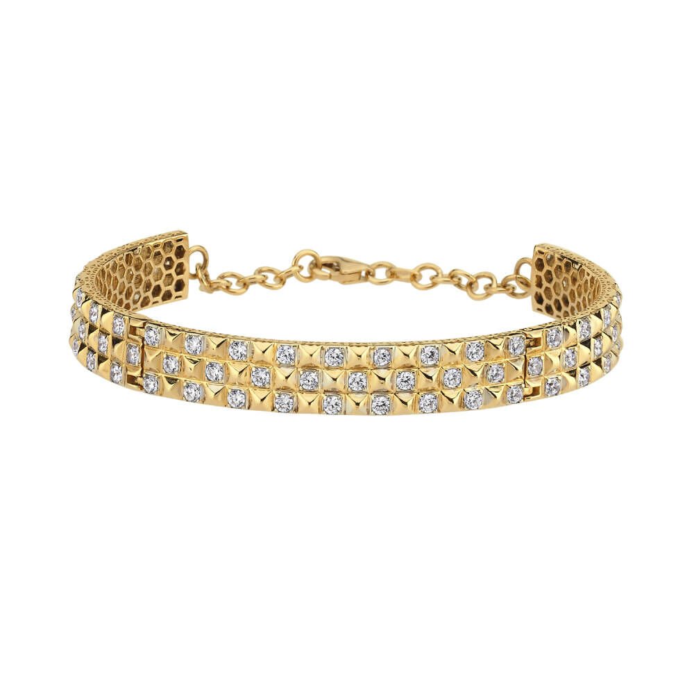 Üç sıralı taş dizilimiyle göz alıcı bir ışıltı sunan tasarım, 14 ayar sarı altından üretilmiş olup 10.04 gram ağırlığındadır. Parlak detaylarla zenginleşen görünümü, zarif ama iddialı bir tarzın ifadesidir.