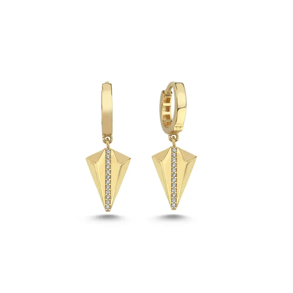 Piramit Küpe, keskin geometrisi ve merkezde yer alan taş sıralamasıyla modern çizgileri şık bir detayla buluşturur. 14 ayar sarı altından üretilmiş olup 3.14 gram ağırlığındadır. Gündüzden geceye her stile zarif bir dokunuş katar.