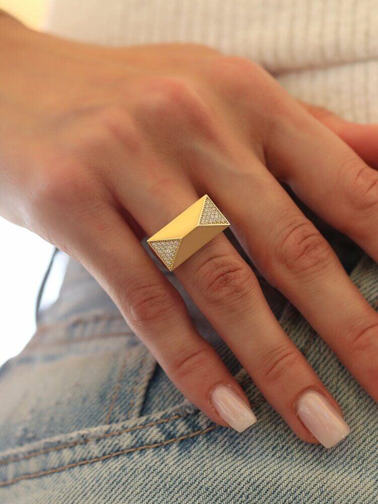 3,06 gram ağırlığında ve 14 ayar sarı altından üretilen Prizma Yüzük, modern dikdörtgen formu ve köşelerindeki ışıltılı taş detaylarıyla dikkat çeker. Geometrik tasarımı ve mat altın dokusunun birleşimi, parmağınızda güçlü ve zarif bir stil sergiler.