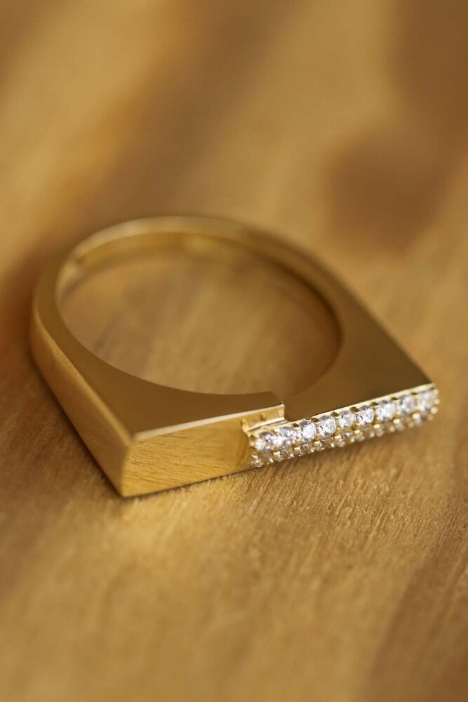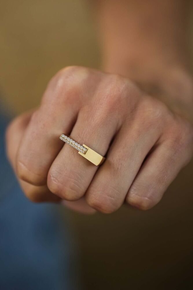 Keskin çizgileriyle çağdaş bir duruş sergileyen Recta, modern tasarımı ve ön yüzünü süsleyen pırlanta detaylarıyla zarafeti buluşturuyor. 2,22 gram 14 ayar sarı altın formu, güçlü ve stil sahibi bir görünüm arayanlar için özel olarak tasarlandı.