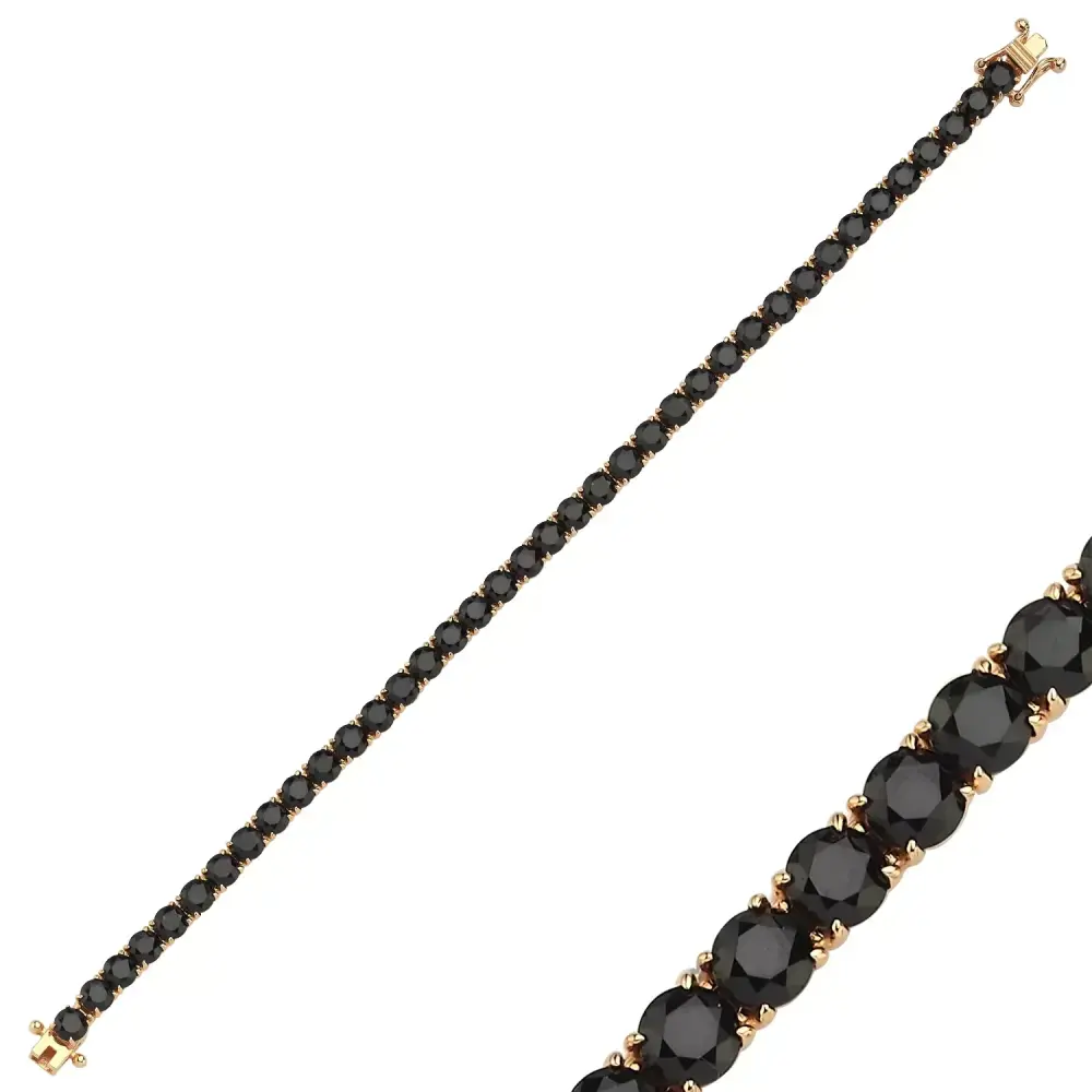 Siyah taşların sıra dışı asaletiyle tasarlanan su yolu bileklik, 14 ayar rose altınla birleşerek güçlü ve modern bir siluet oluşturur. 11.38 gram ağırlığındaki bu zarif model, kontrast renk uyumuyla fark yaratırken, stiline gizemli ve şık bir dokunuş katmak isteyenler için etkileyici bir seçenektir.