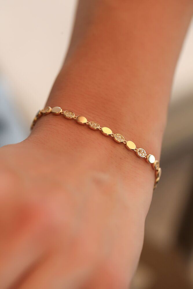 4,42 gram ağırlığında ve 14 ayar sarı altından üretilen Viona Bileklik, gün boyu konfor sunan hafif yapısı ve göz alıcı parlaklığıyla öne çıkıyor. Özel kesim altın pulların yarattığı ritmik doku, pırıltılı taşların enerjisiyle birleşerek stilinize modern bir prestij katar.