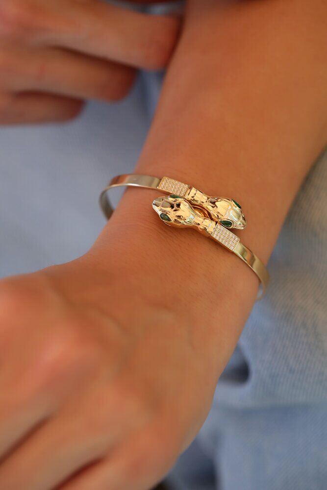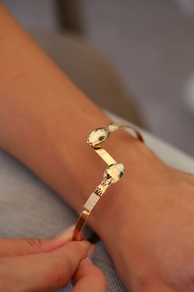12,28 gram ağırlığında ve 14 ayar sarı altından üretilen Vipera Kelepçe, gücün ve yenilenmenin sembolü olan yılan formunu sanatsal bir derinlikle sunar. Keskin hatları ve göz alıcı detaylarıyla stilinize gizemli ve prestijli bir dokunuş katan bu tasarım, usta el işçiliğinin en seçkin örneklerinden biridir.