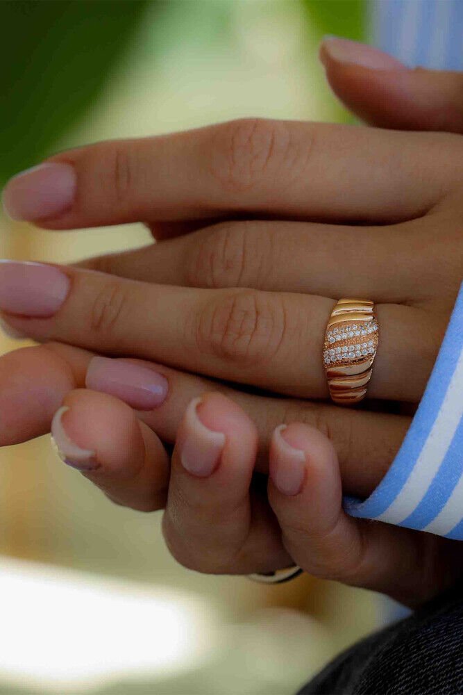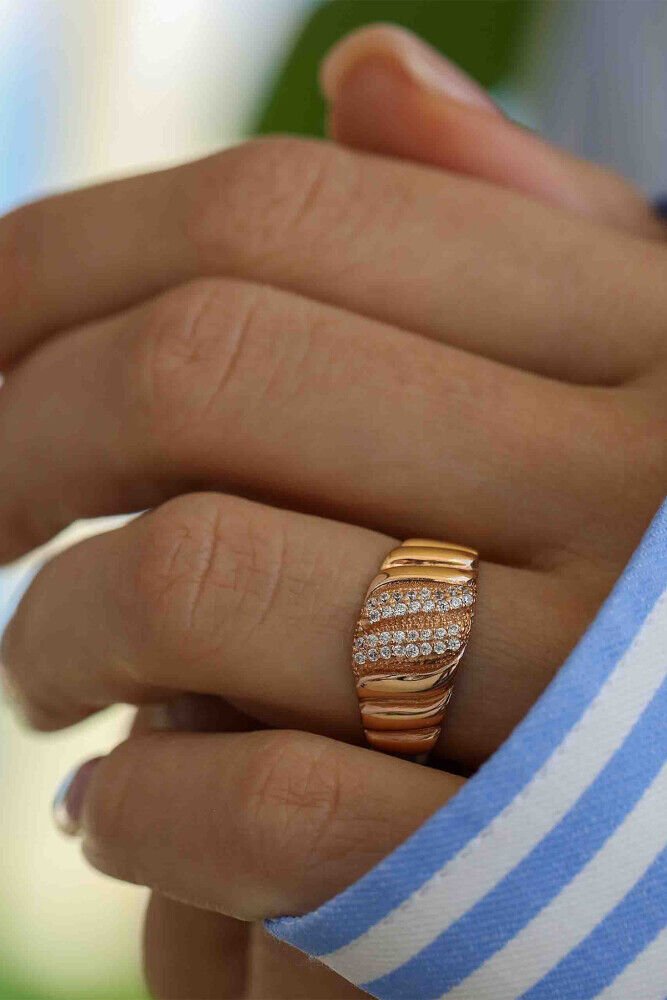 Organik kıvrımları ve ışıltılı taş geçişleriyle dikkat çeken bu özel model, 14 ayar rose altından üretilmiştir. 2.17 gram ağırlığıyla zarif ama güçlü bir görünüm sunar. Modern şıklığıyla her stile uyum sağlar.