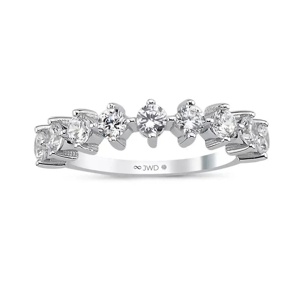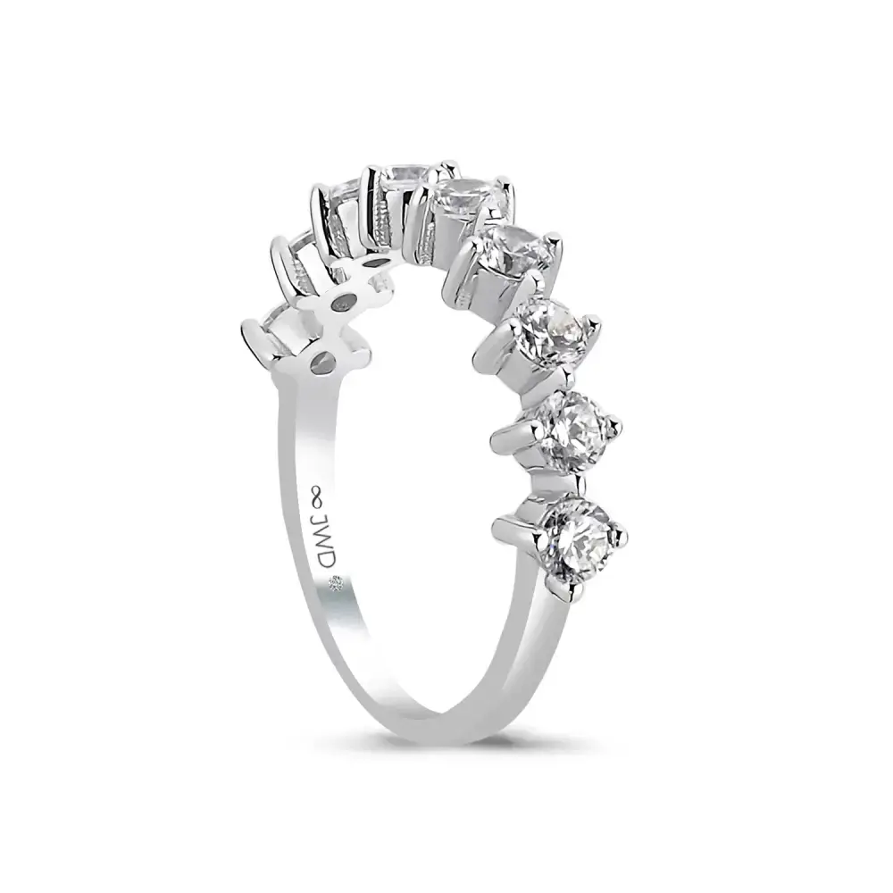 2.85 gram ağırlığında, 14 ayar beyaz altından tasarlanan zarif Yarımtur Yüzük, yan yana dizilmiş