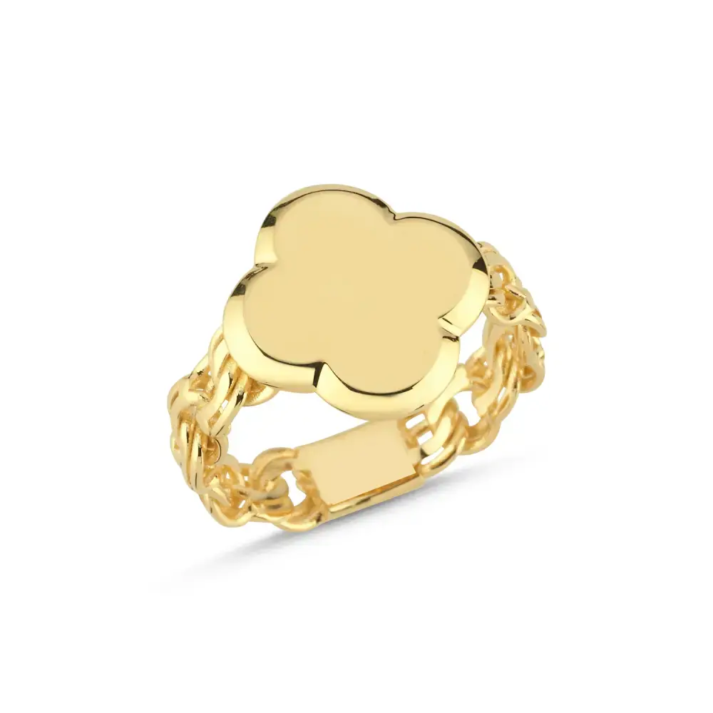 Zarafeti simgeleyen bu özel yonca yüzük, şansın ve şıklığın bir araya geldiği eşsiz bir tasarıma sahiptir. 14 ayar sarı altından üretilmiş olup 3.55 gram ağırlığındadır. Her detayında özen barındıran bu parça, stilinizi tamamlayacak anlamlı bir dokunuş sunar.